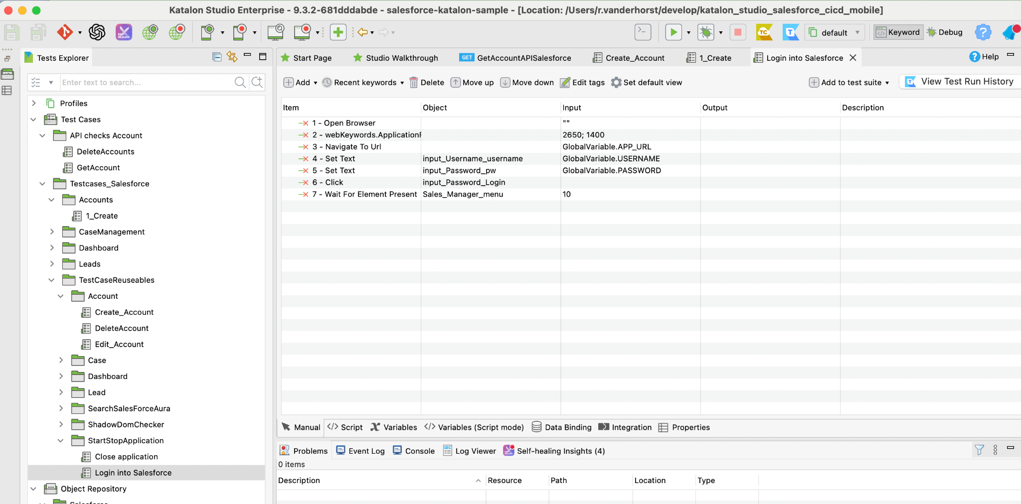 The record and playback tool has already performed the initial steps by creating the necessary objects and testcase for logging in and creating an account. After some rearrangement, you’ll notice a structure similar to the example provided. It’s worth noting that I have significantly reorganized my page objects; similarly, you may need to adjust the definitions to better suit your preferences.
